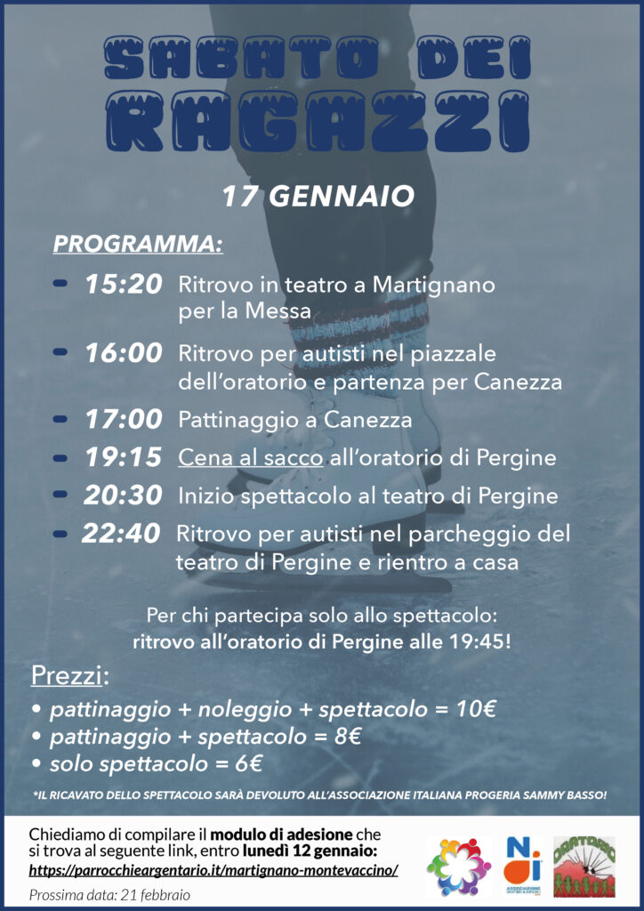 Il “Sabato dei Ragazzi” è un’attività per i ragazzi delle medie organizzata dalla nostra associazione con lo scopo di crescere l’armonia e di far assaporare la gioia dello stare insieme. Solitamente il sabato dei ragazzi inizia ad ore 17.30 con il ritrovo davanti alla Chiesa parrocchiale, lì i ragazzi partecipano e animano la s. Messa. Terminata la celebrazione, assieme agli animatori parrocchiali, si dirigono all’oratorio della comunità dove continuano la serata con la cena ed un gioco a sorpresa.