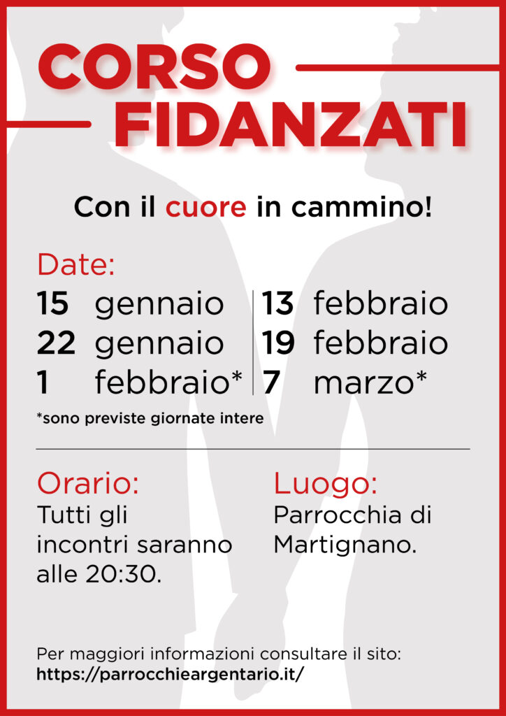 Per celebrare il Matrimonio è necessario contattare il parroco per definire la data del giorno del Matrimonio, sarà poi necessario frequentare i corsi fidanzati secondo il calendario esposto nella bacheca parrocchiale (non è necessario seguire il corso fidanzati presso la propria comunità, sul sito della Diocesi è possibile trovare il calendario completo dei vari corsi).